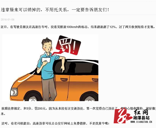 中国湘潭县网1月19日讯(记者 彭圆)近日,微信朋友圈一则“违章原来可以销掉的,不用托关系,一定要告诉朋友们!”的消息泛滥,文章指出,近日,有驾驶员朋友在高速行车时,没看见限速100km/h的标志,结果超速超了12%,过了两天收到短信才发现。按照法律规定,扣3分,罚200元。因为从来没有过交通违法,第一次觉得自己违法了,那种心情你懂的,就好像美国大片里被通缉的那种感觉,自顾自紧张起来。 这时,有老司机提出:高速违章可以去公安厅网站上免费销掉,不是找黄牛哦!