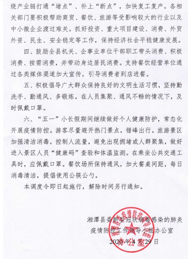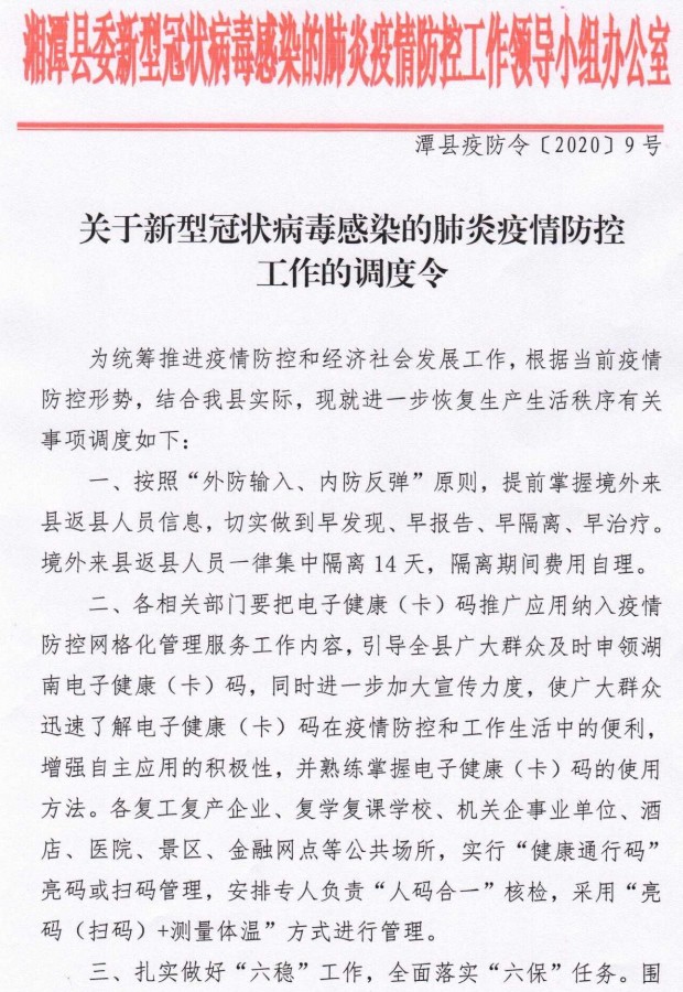 【权威发布】湘潭县疫防令〔2020〕9号调度令