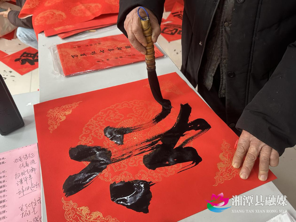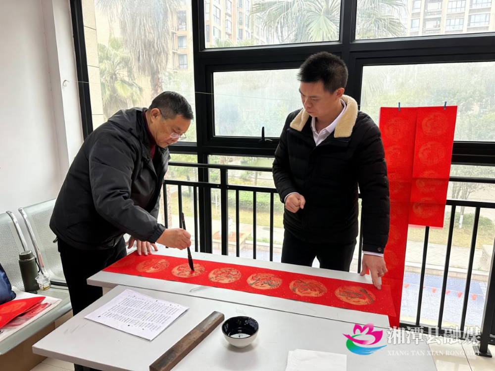 湘潭县融媒体中心2月10日讯(实习记者 莫叶)新春将至,年味渐浓。近日,湘潭县锦绣名都小区物业服务中心特邀书法协会的老师现场挥毫泼墨,为业主们书写春联与“福”字,以笔墨传递温暖,用祝福点亮新年。